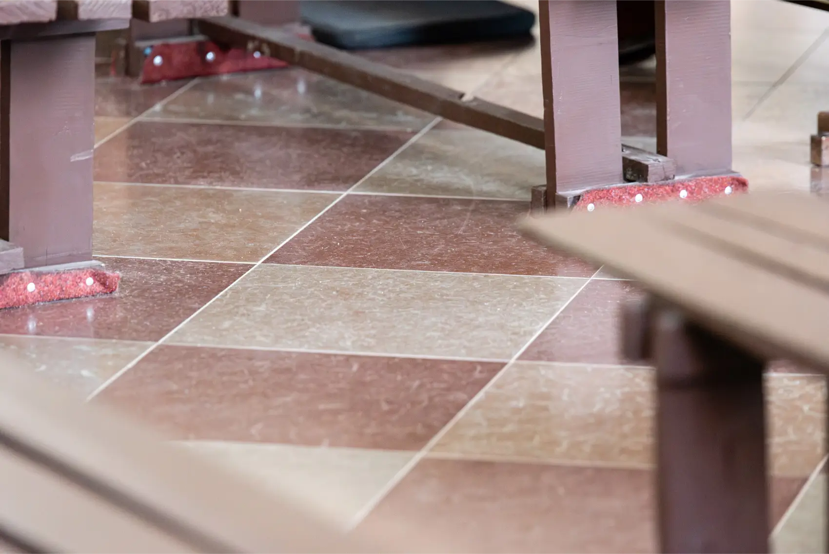 Autentiškas istorinis grindinys atnaujintas naudojant istorinį natūralų švedišką kalkakmenį – šlifuoto matinio paviršiaus akmuo vizualiai dera su istoriniu interjeru ir atspindi subtilią istorinę prabangą.