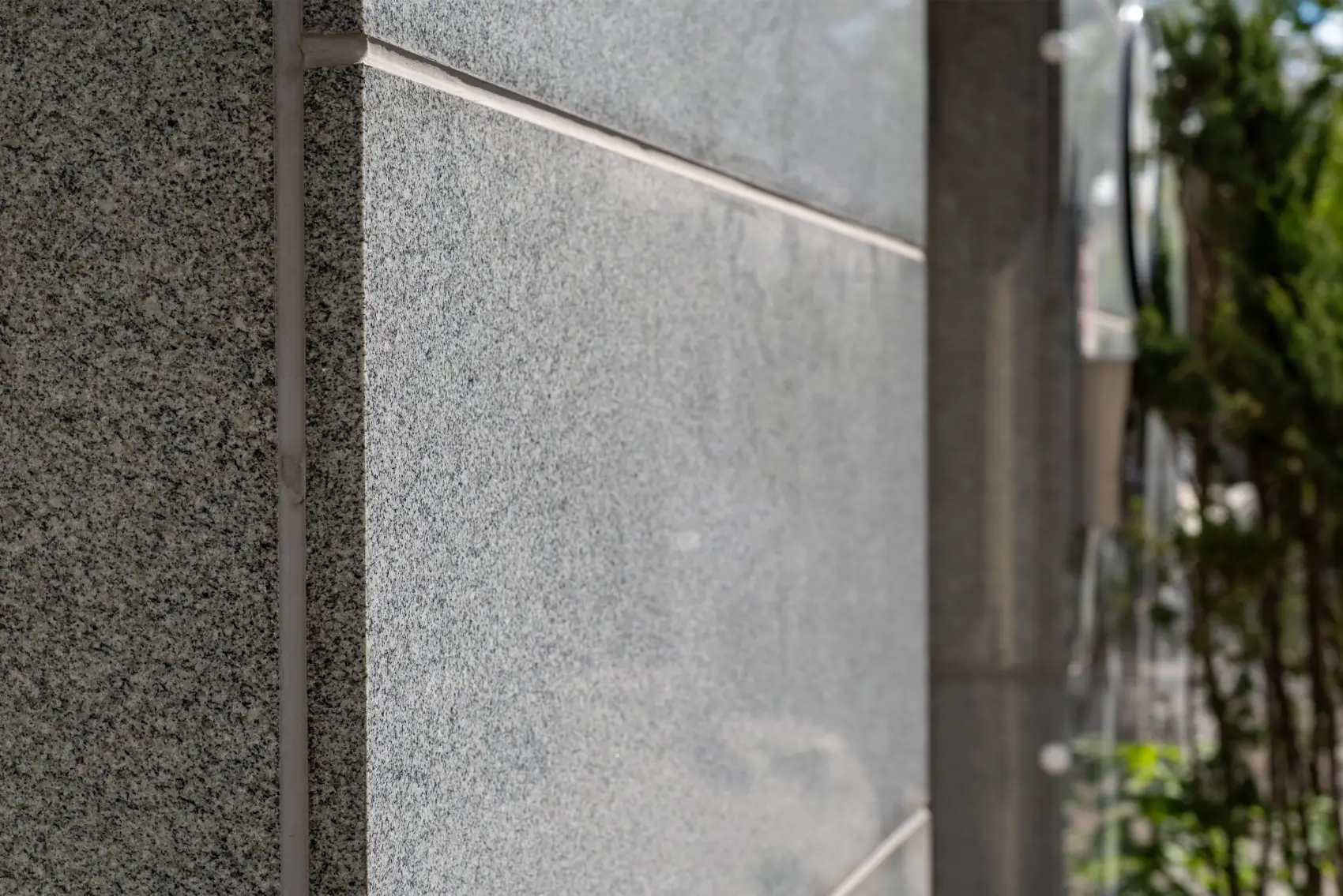 JAV ambasados Vilniuje fasadas išsiskiria santūria elegancija ir aukščiausios kokybės apdaila, perteikiančia prestižą ir patikimumą. Poliruoto Kuru Grey granito  danga puikiai dera prie architektūrinės pastato visumos. Subtili pilko granito tekstūra kuria modernios klasikos įspūdį.