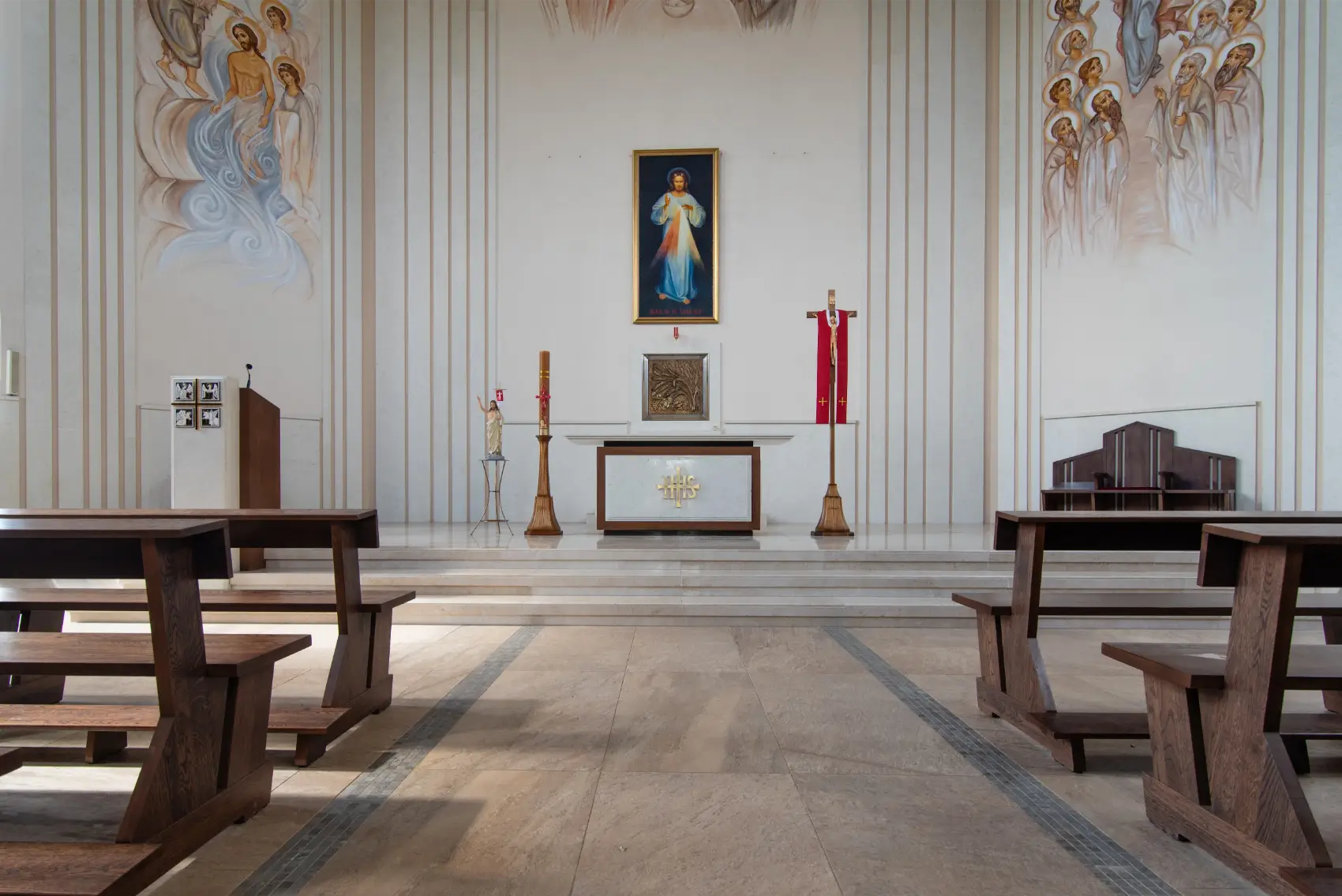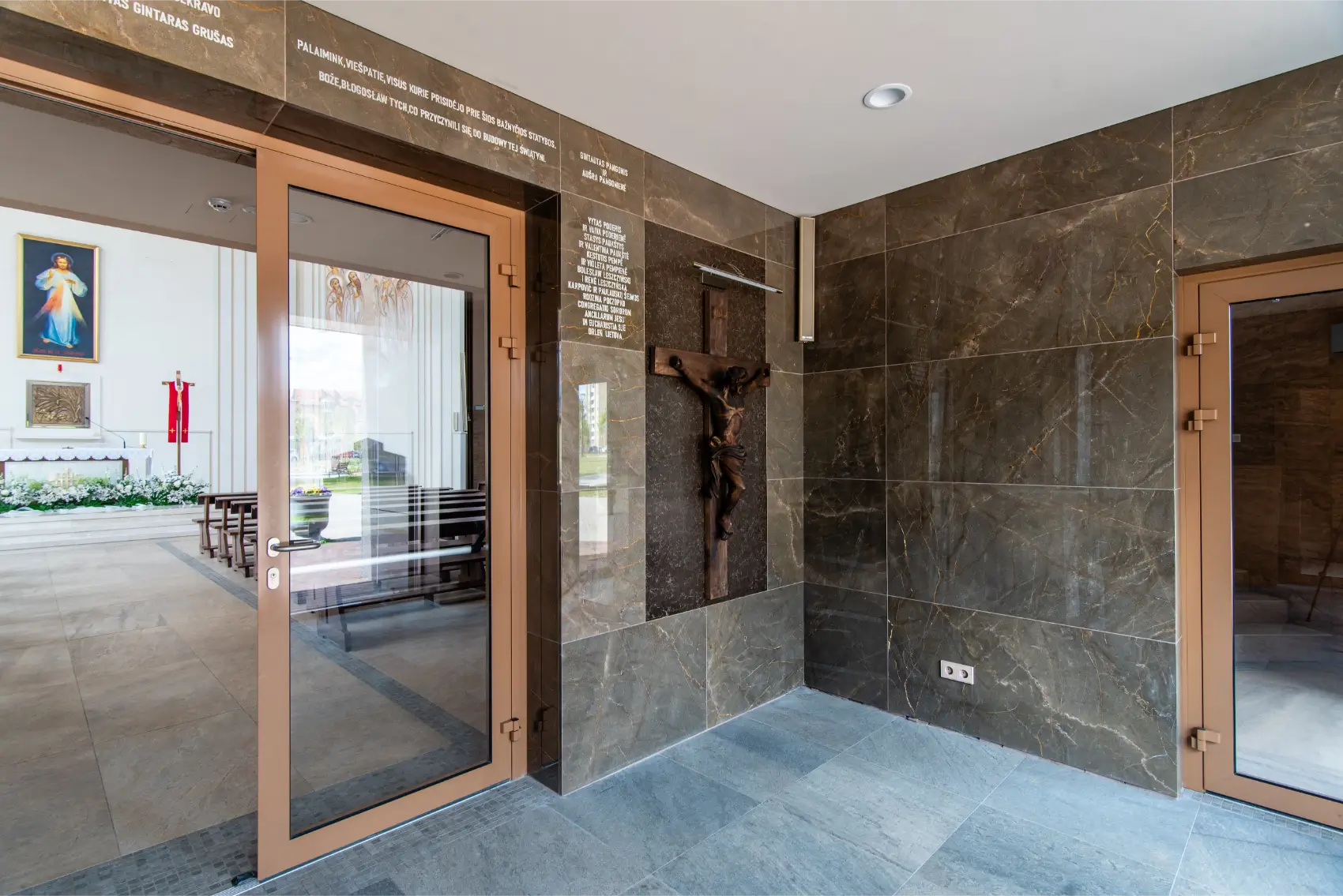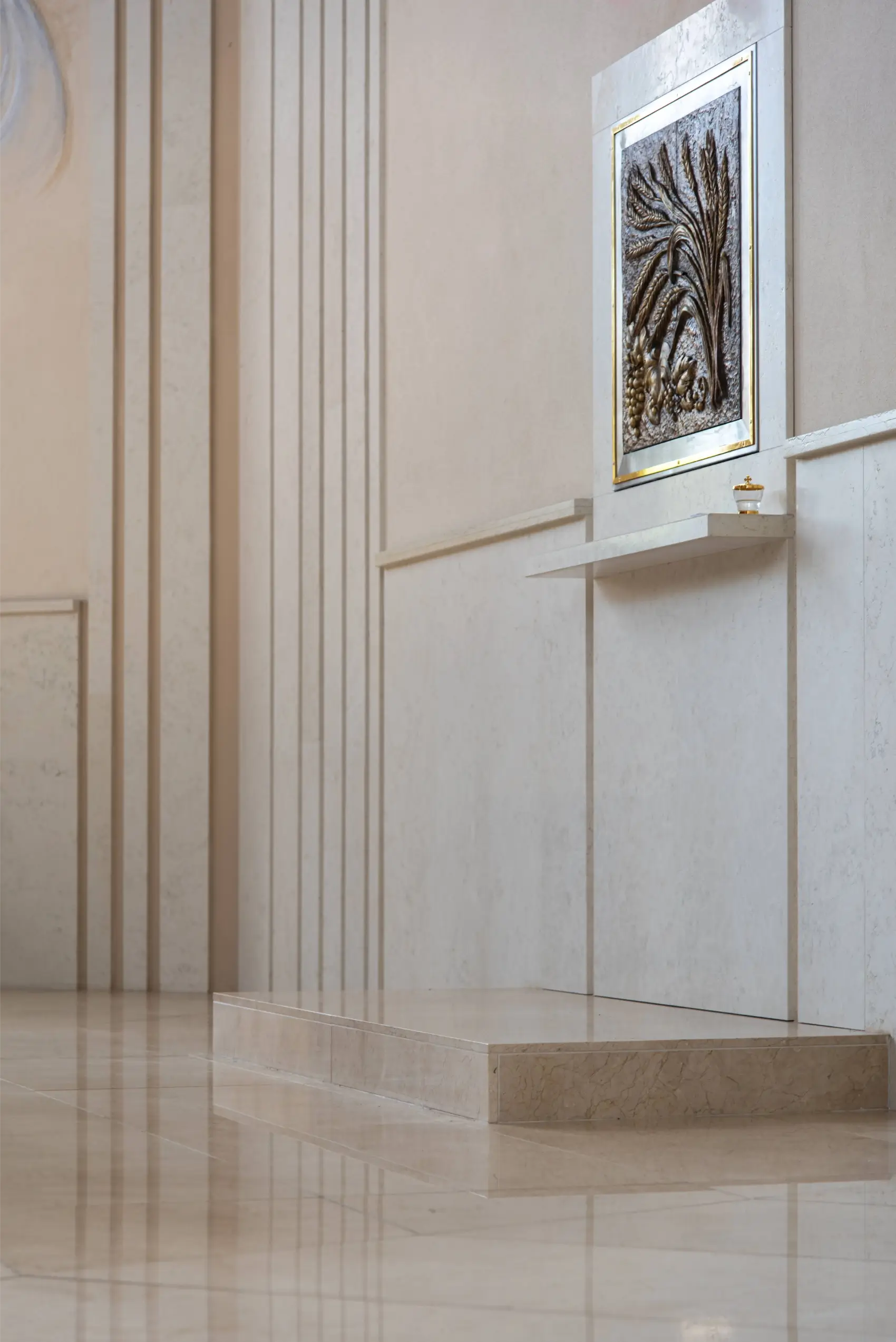 Įžengus pro tambūrą, dėmesį patraukia šiltas, raudonai rudos spalvos Mahogany granitas iš Švedijos – poliruotas paviršius subtiliai atspindi šviesą ir kuria jaukumo įspūdį. Presbiterijos centras, altorius, laiptai ir sakykla sukurti iš šviesaus ir prabangaus Amani Gold marmuro, kuris savo auksiniais tonais simbolizuoja dvasinį kilnumą. Sienoms pasirinktas gludintas, matinis Crema Marfil marmuras iš Ispanijos – šviesus, švelnus fonas, pabrėžiantis sakralinių akcentų didingumą.