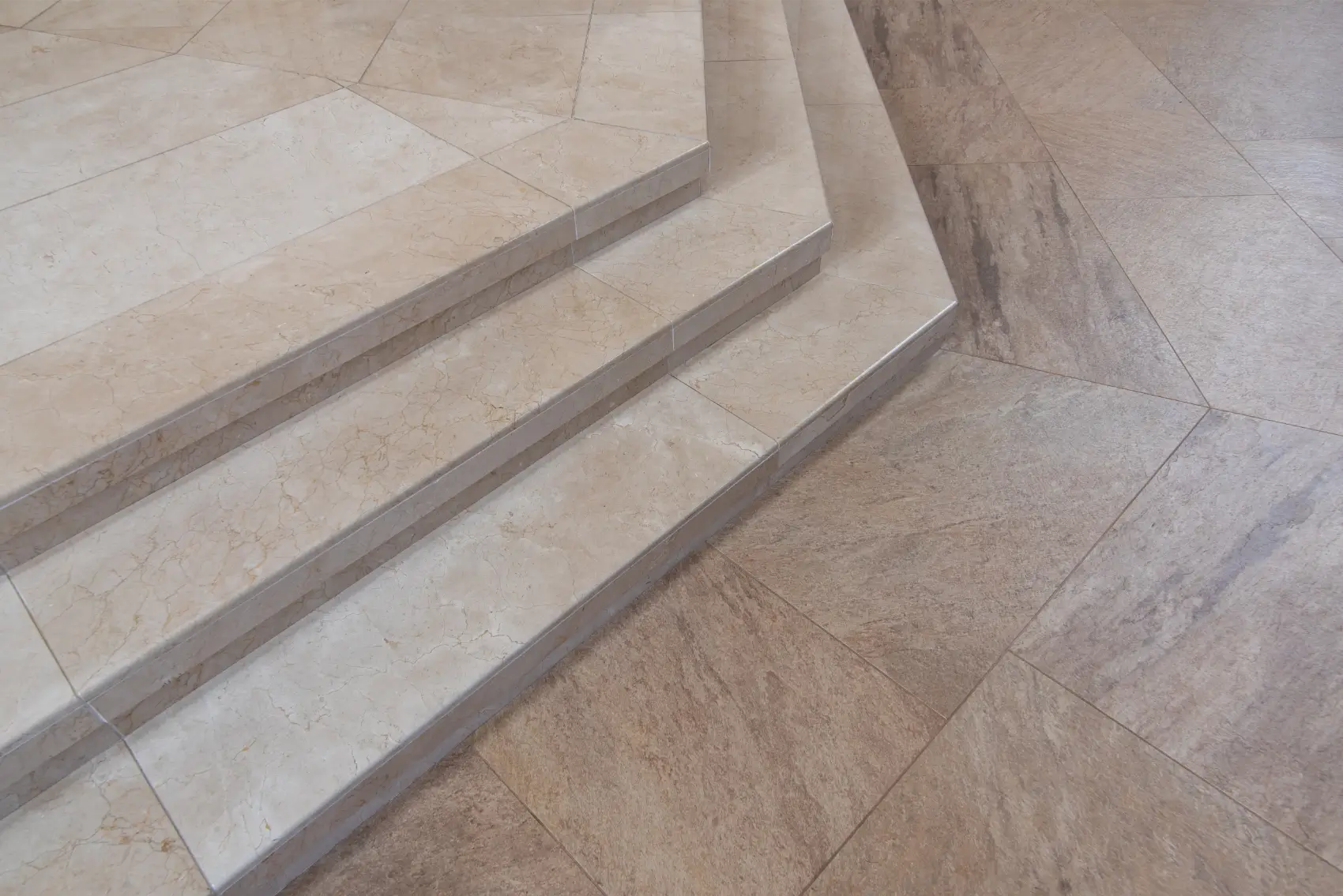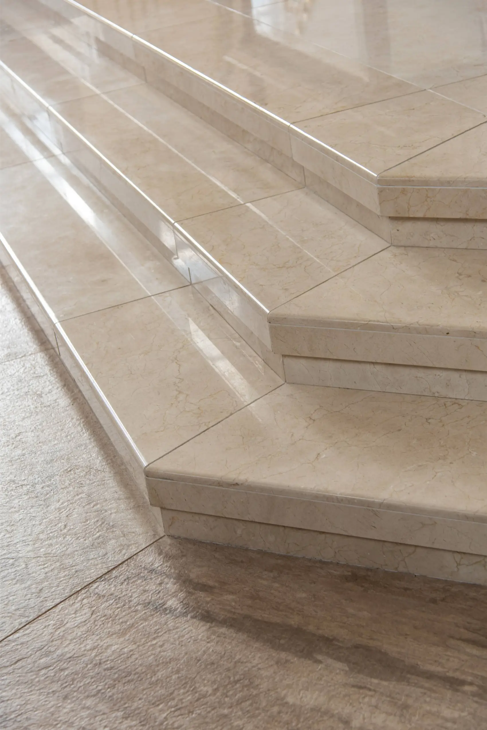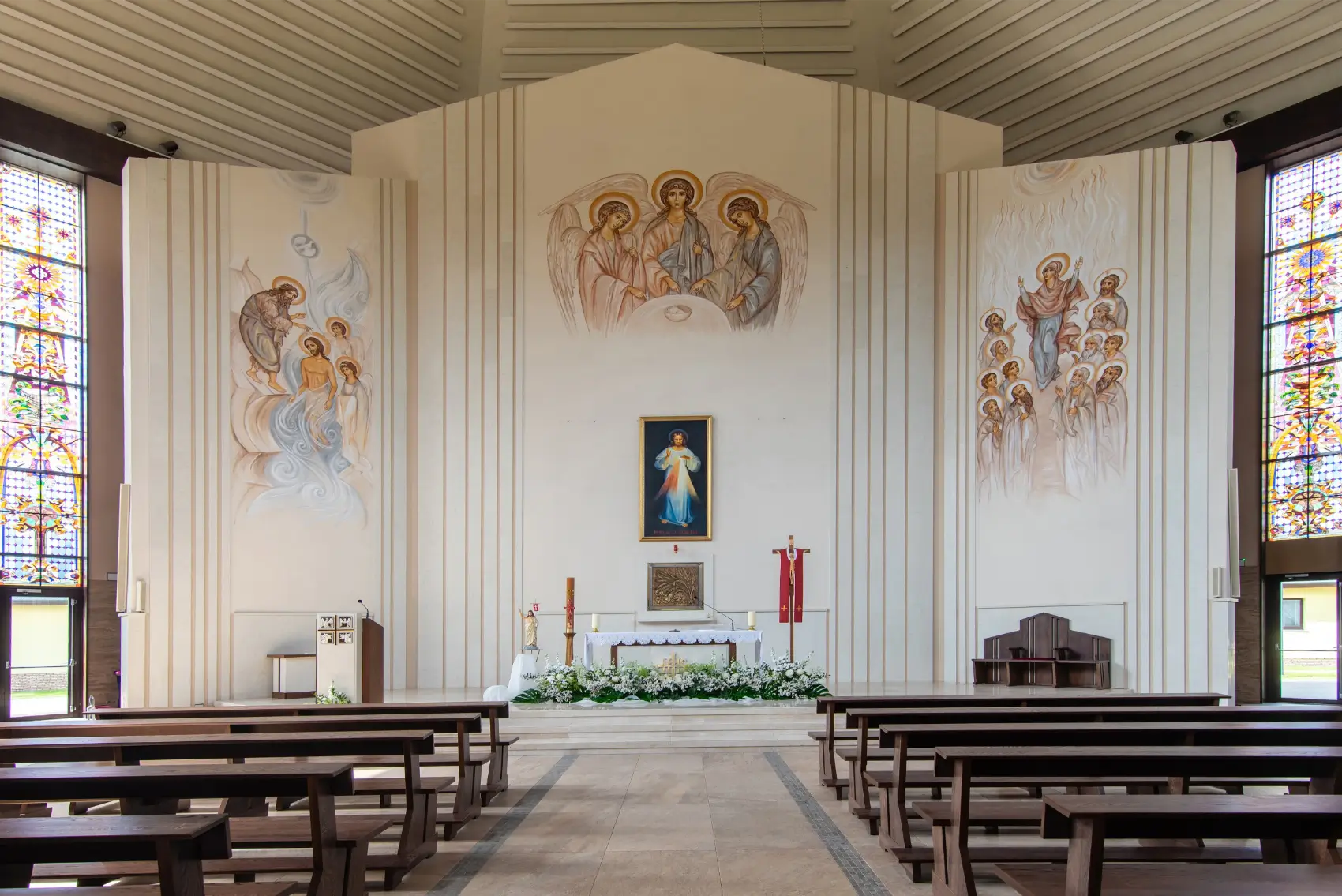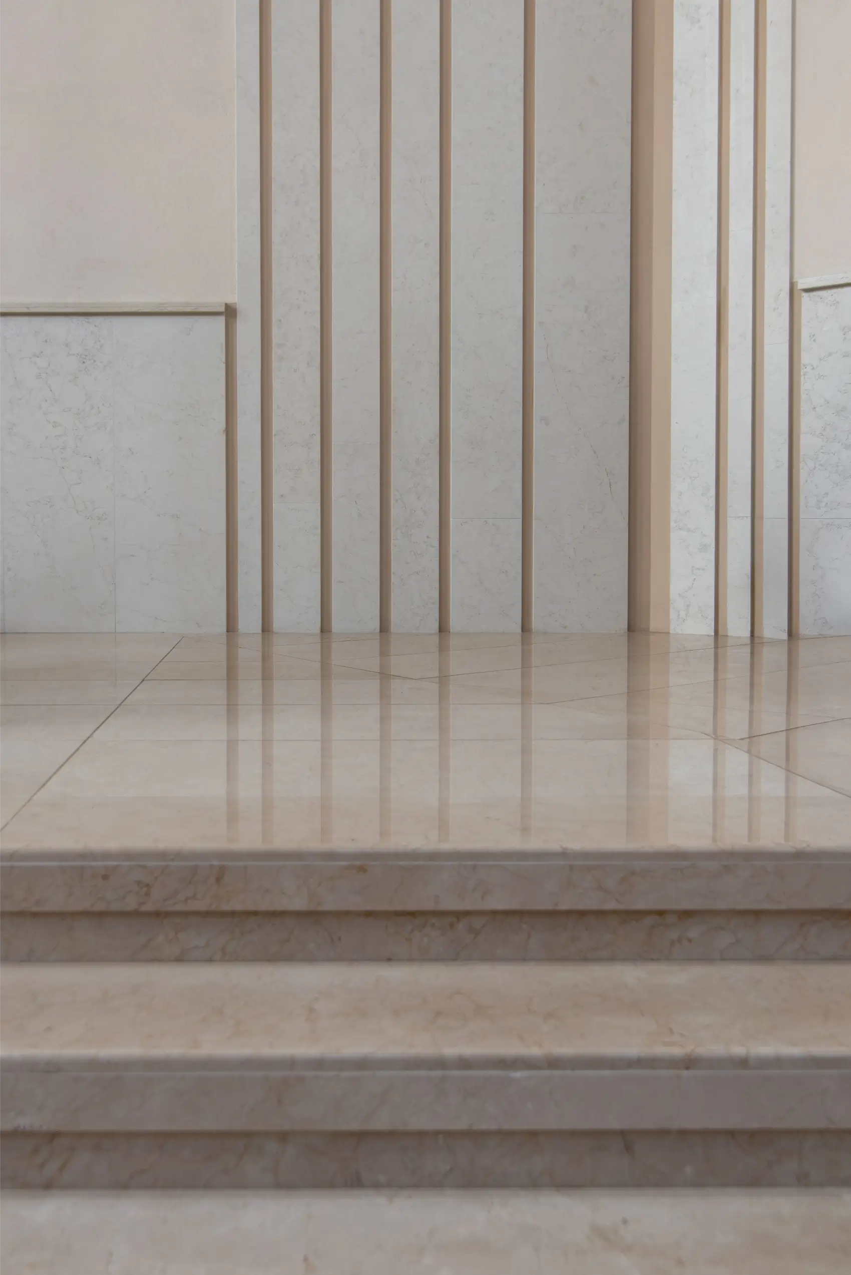 Įžengus pro tambūrą, dėmesį patraukia šiltas, raudonai rudos spalvos Mahogany granitas iš Švedijos – poliruotas paviršius subtiliai atspindi šviesą ir kuria jaukumo įspūdį. Presbiterijos centras, altorius, laiptai ir sakykla sukurti iš šviesaus ir prabangaus Amani Gold marmuro, kuris savo auksiniais tonais simbolizuoja dvasinį kilnumą. Sienoms pasirinktas gludintas, matinis Crema Marfil marmuras iš Ispanijos – šviesus, švelnus fonas, pabrėžiantis sakralinių akcentų didingumą.
