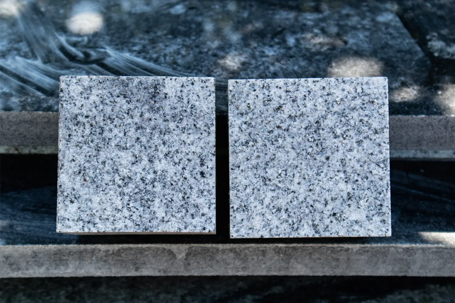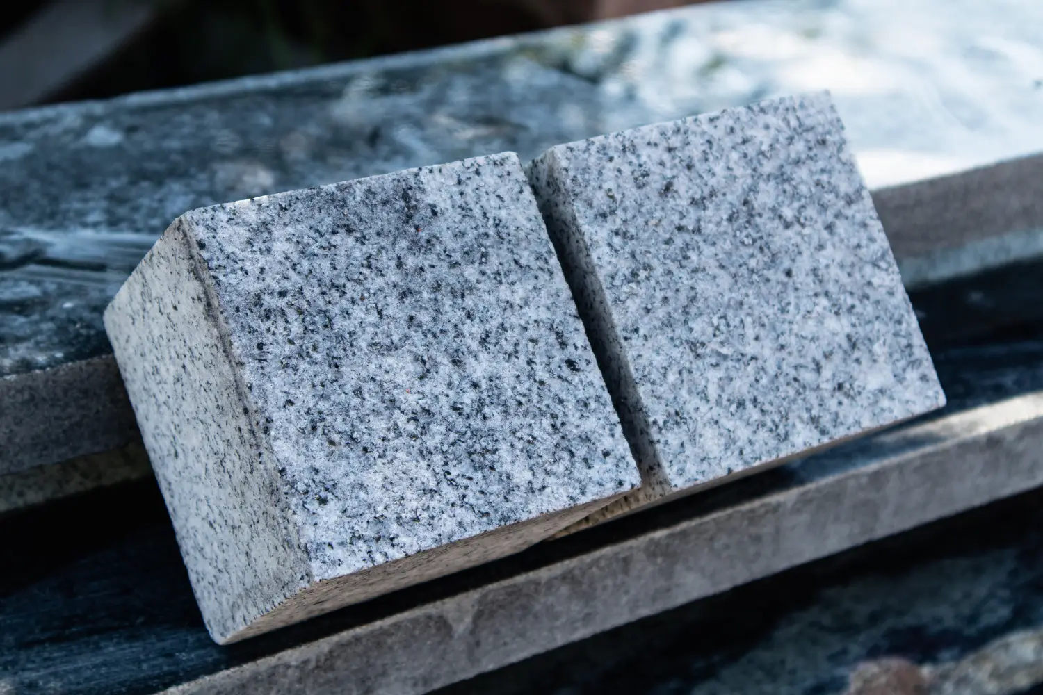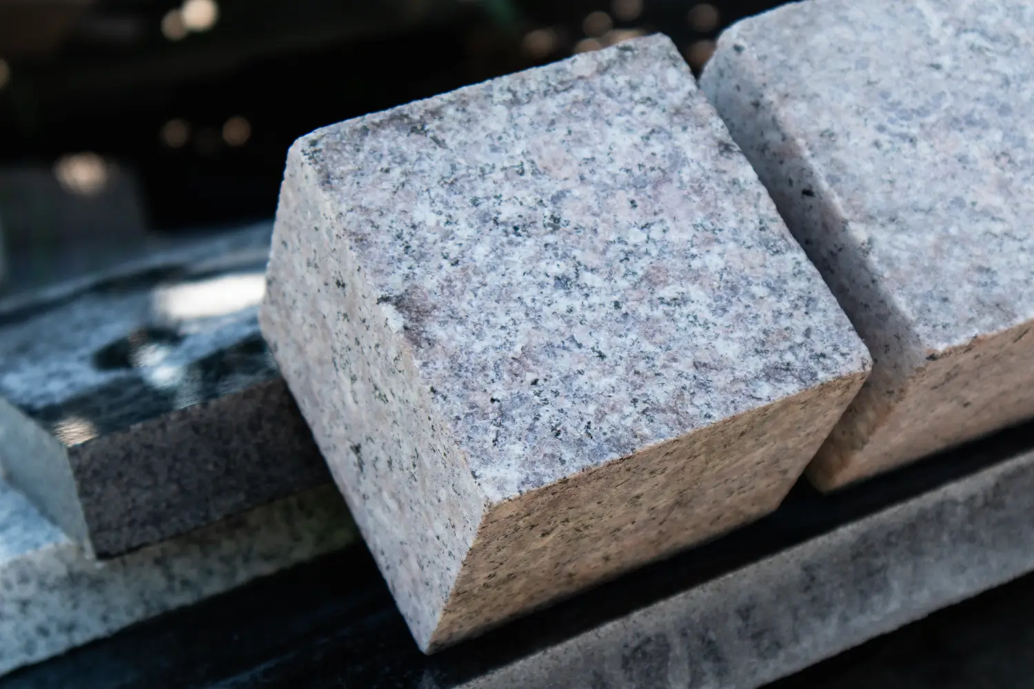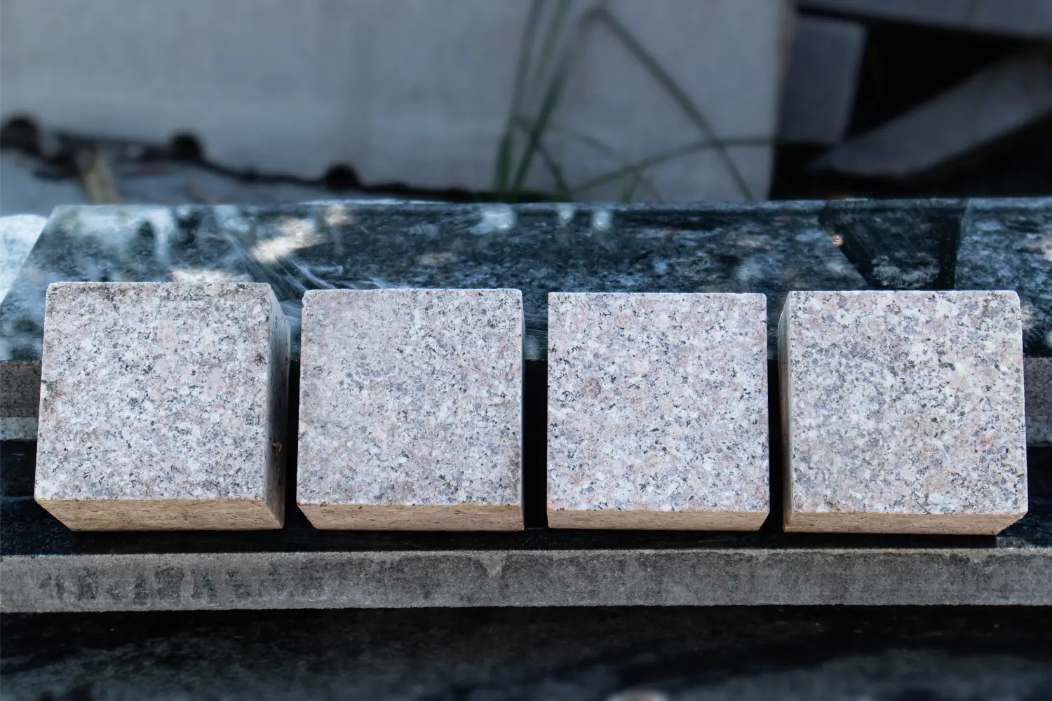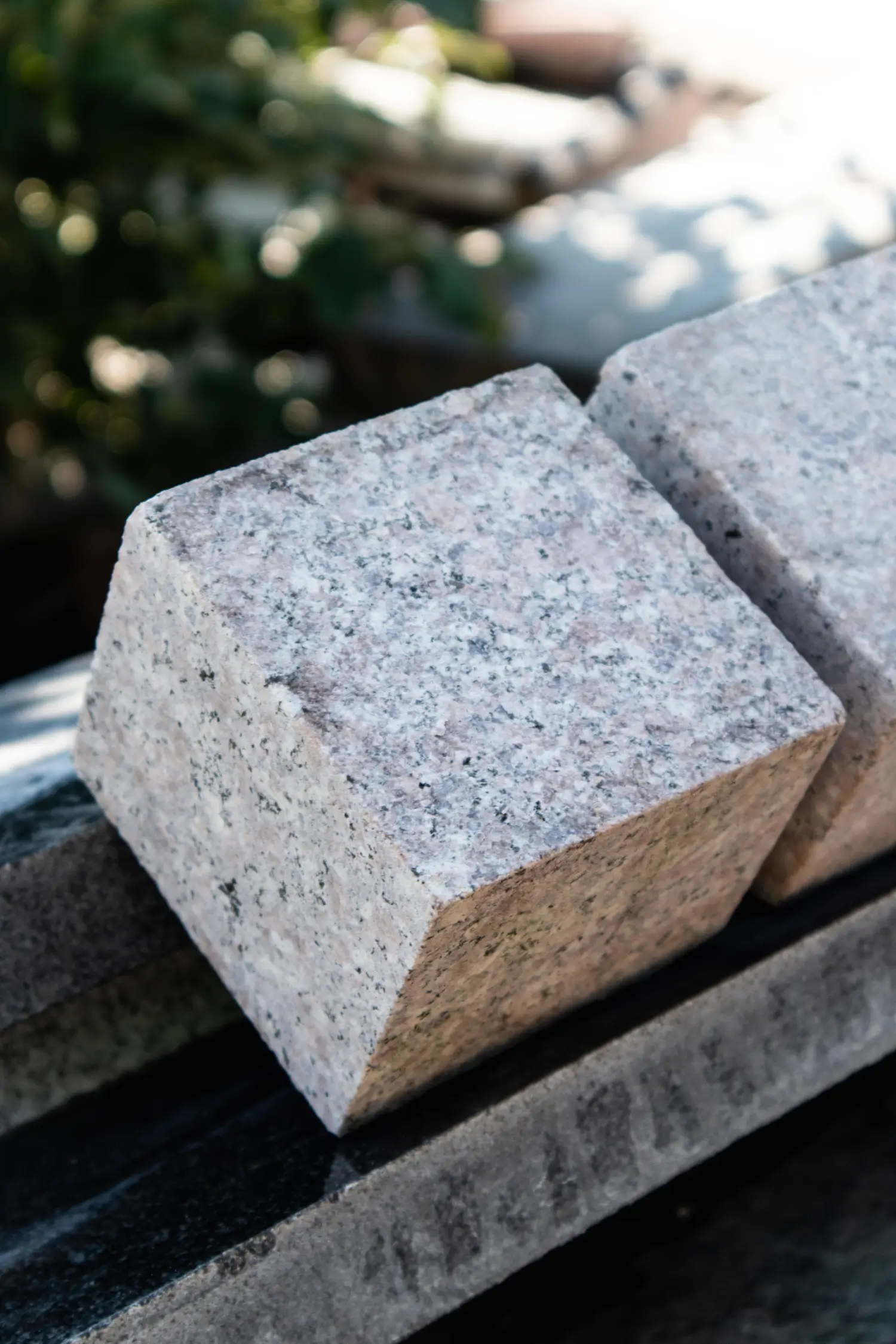 Pilkos ir rausvos spalvos. Viršus degintas, šonai pjauti. ilkų ir rausvų granito trinkelių likutis po 30 m². Tinka tiek vidaus, tiek lauko grindų dangai, kapavietės apdailai.